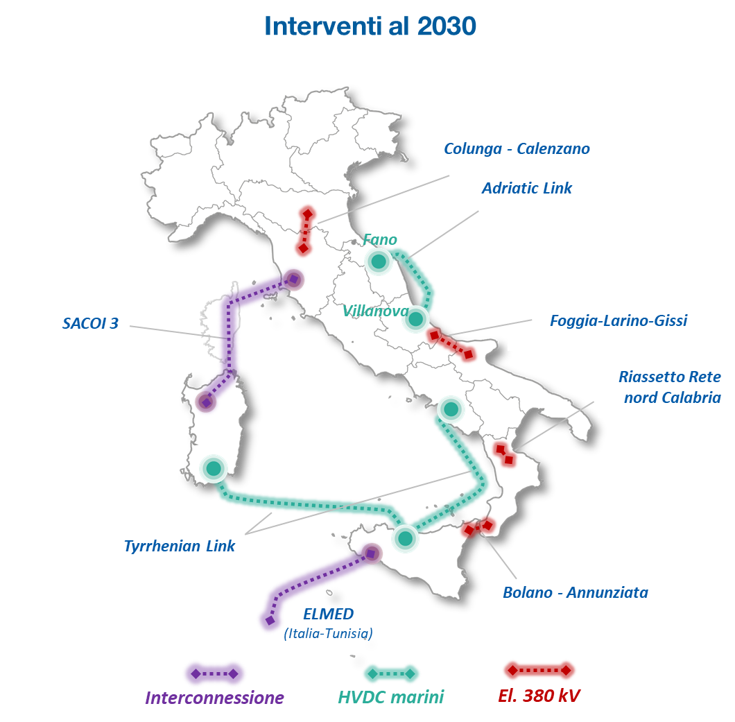 - Adriatic Link: il collegamento HVDC tra Abruzzo e Marche da 1.000 MW di potenza lungo circa 250 km, di cui 210 km sottomarini. Ha ottenuto il via libera del Mase a gennaio 2024 e i cantieri terrestri sono partiti a fine 2024. L’entrata in esercizio è prevista per il 2029.