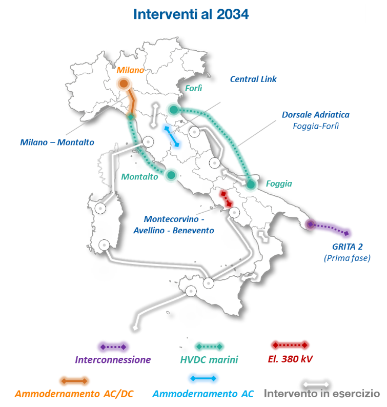 - Dorsale Adriatica: collegamento in corrente continua tra Foggia e Forlì che garantirà il rafforzamento del corridoio adriatico.