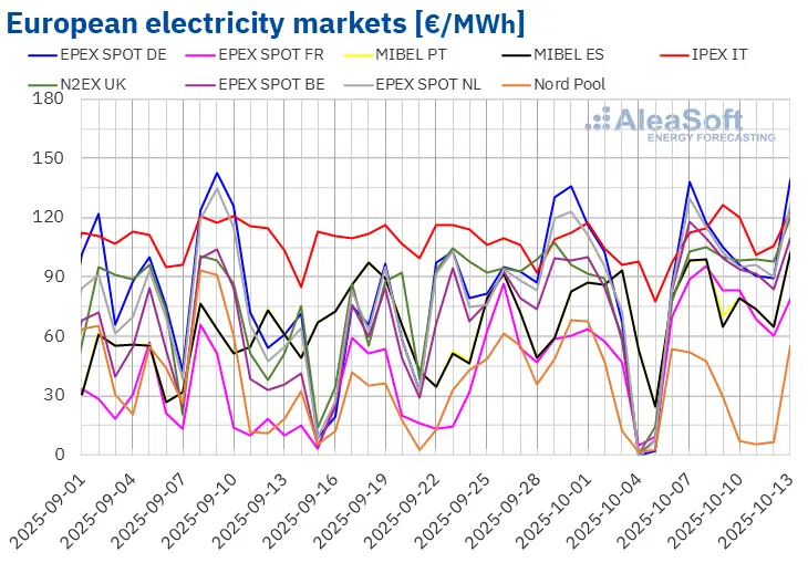 “Nella settimana del 6 ottobre, le medie settimanali hanno superato i 75 €/MWh nella maggior parte dei mercati elettrici europei. L’eccezione è stata il mercato nordico, con una media di 28,85 €/MWh. I mercati olandese, tedesco e italiano hanno registrato le medie settimanali più elevate, rispettivamente 101,74 €/MWh, 103,27 €/MWh e 111,11 €/MWh. Negli altri mercati analizzati da AleaSoft Energy Forecasting, i prezzi hanno oscillato tra 78,47 €/MWh nel mercato francese e 97,31 €/MWh nel mercato N2EX del Regno Unito”, ha scritto la società di consulenza.