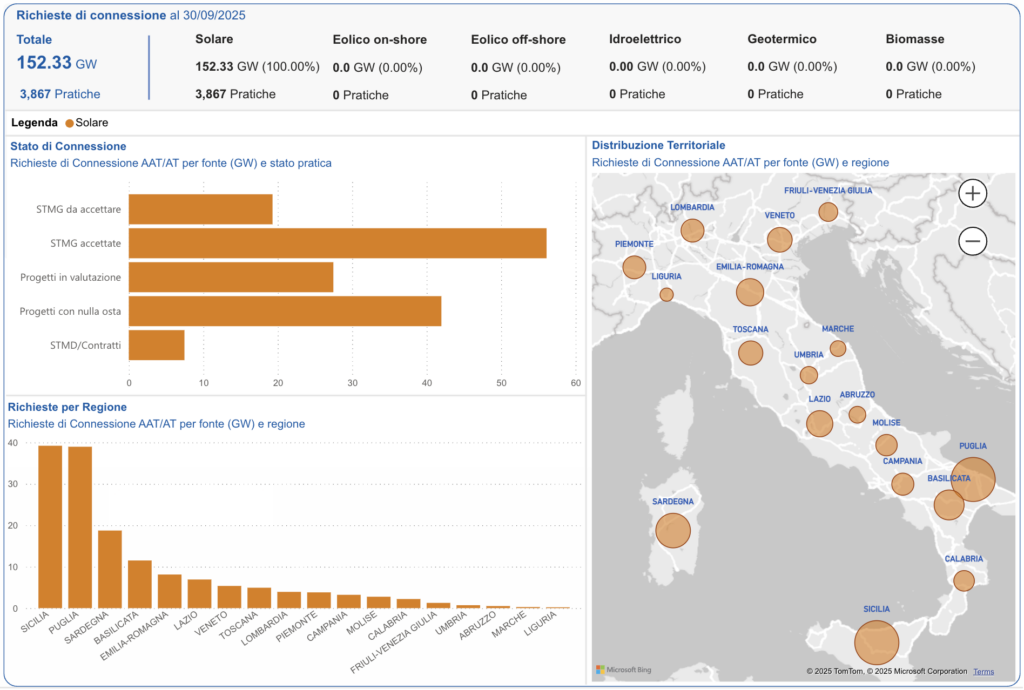 Al 30 settembre risultano 3.867 pratiche per 152,33 GW di richieste di connessione per impianti fotovoltaici in Italia. Lo si apprende dall’aggiornamento del portale Econnextion di Terna. Il numero di fascicoli è in leggero calo rispetto al precedente aggiornamento, così come la potenza complessiva, mentre sono cresciute le pratiche ready-to-build per progetti solari che salgono a 168 per 7,47 GW di potenza.