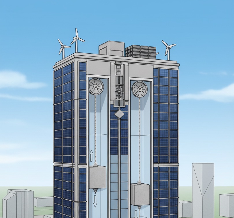 Il sistema, basato su un meccanismo a funi e carrucole, è pensato per funzionare in combinazione con facciate fotovoltaiche installate sui lati sud, est e ovest, oltre che con piccole turbine eoliche da tetto e batterie agli ioni di litio (Li-ion).