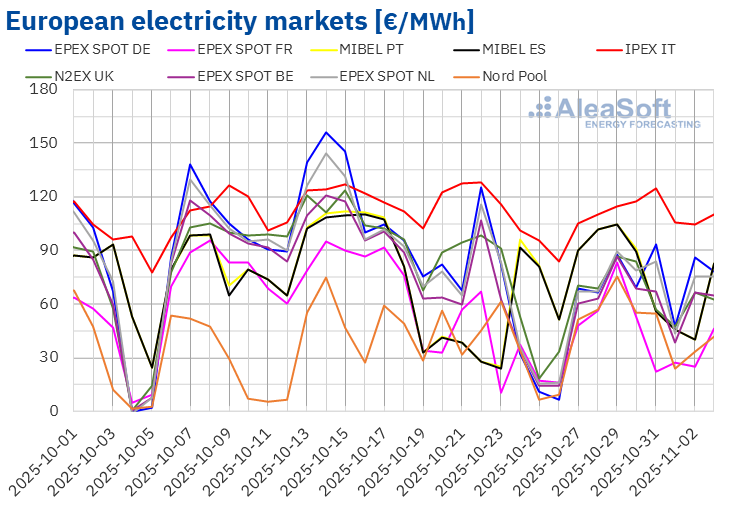 Per quanto riguarda i prezzi giornalieri, il mercato francese ha registrato la media più bassa della settimana tra i mercati analizzati, pari a 22,31 €/MWh, il 31 ottobre. D’altra parte, durante l’ultima settimana di ottobre, i prezzi giornalieri sono rimasti sopra i 100 €/MWh nel mercato italiano. Anche i mercati spagnolo e portoghese hanno registrato prezzi superiori a 100 €/MWh il 28 e il 29 ottobre. Il 31 ottobre il mercato italiano ha raggiunto la media giornaliera più alta della settimana, pari a 124,53 €/MWh. Nel caso del mercato nordico, il 29 ottobre il prezzo giornaliero è stato di 75,43 €/MWh, il più alto dal 10 settembre.