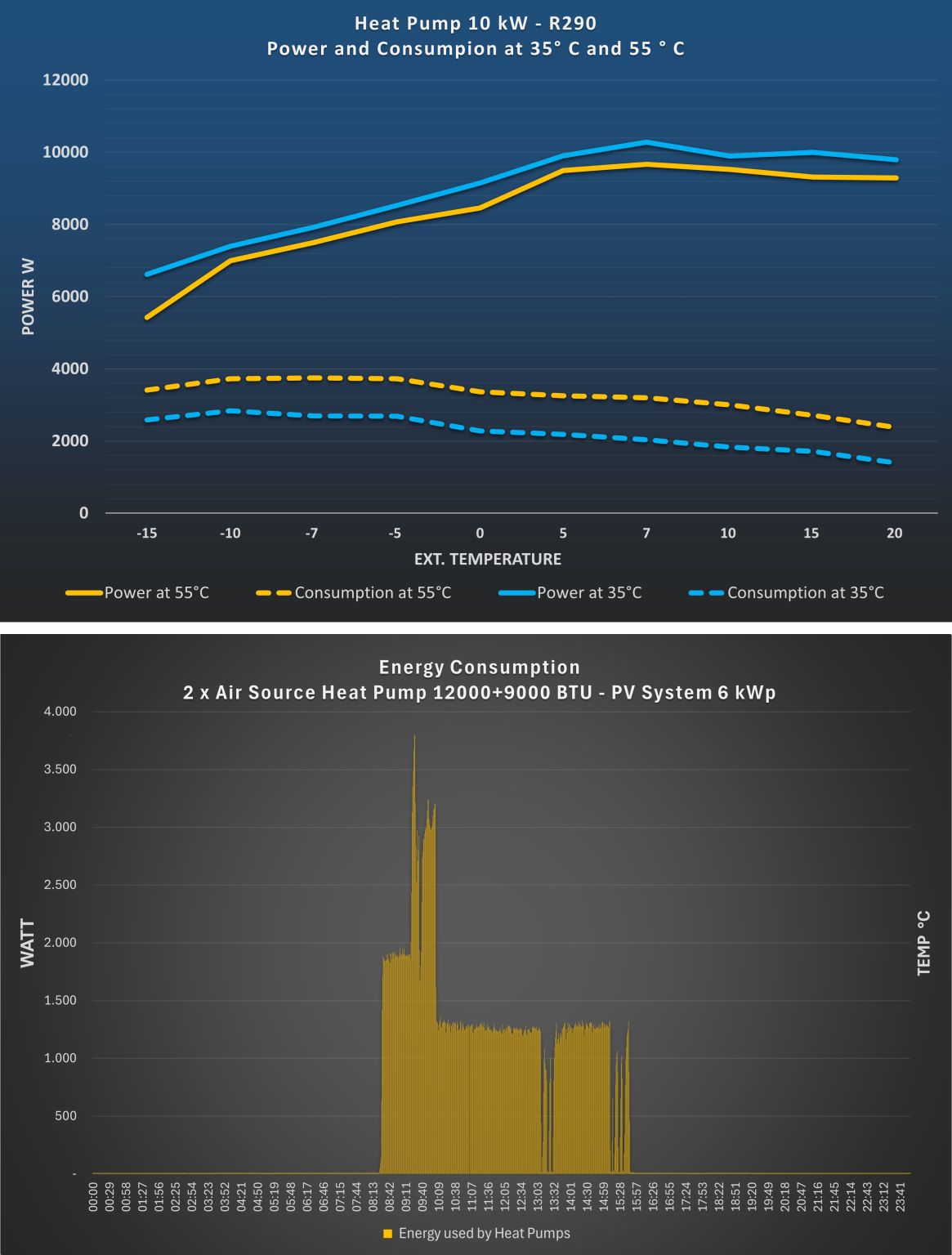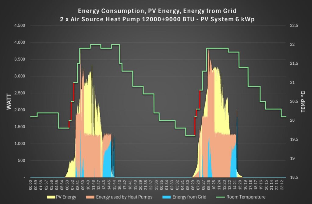 Questi dati confermano che, in condizioni climatiche miti, la combinazione pompe di calore+ fotovoltaico può mantenere il riscaldamento domestico a costi molto bassi. Anche il riscaldamento mattutino potrebbe essere gestito solo dalle pompe di calore con spese contenute.