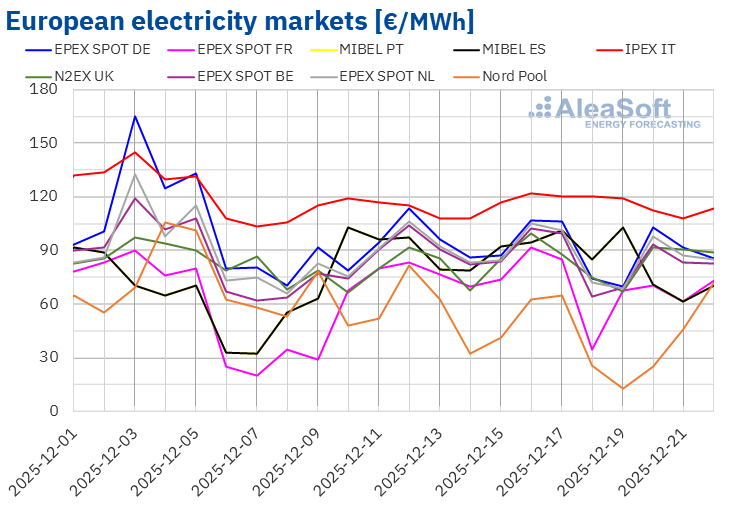 Per quanto riguarda i prezzi giornalieri, venerdì 19 dicembre il mercato nordico ha registrato la media più bassa della settimana tra i mercati analizzati, pari a 12,54 €/MWh.