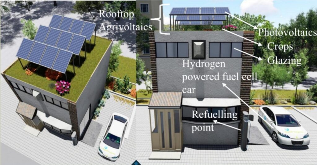 Un gruppo di ricerca dell’Università di Exeter ha studiato un concetto modulare di produzione di idrogeno alimentato da agrivoltaico per le abitazioni. L’agrivoltaico installato sui tetti alimenta un elettrolizzatore che produce idrogeno per veicoli a idrogeno e per finestre intelligenti fotocromatiche a idrogeno isolate. Le finestre sono una forma di vetro termoisolante che si oscura o si schiarisce attraverso reazioni reversibili con idrogeno e ossigeno, consentendo il controllo della luce e del calore.