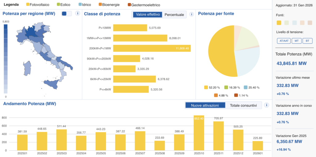 In termini di potenza, la nuova capacità di generazione aggiunta è pari a 6.530,67 MW (+16,94%) rispetto a gennaio 2025.
