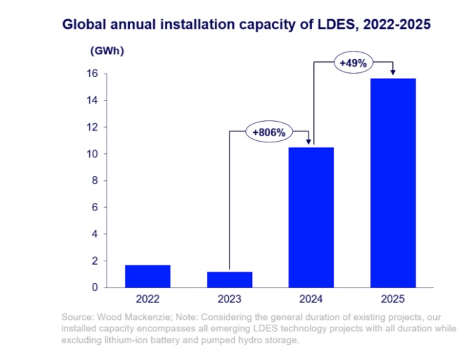 Secondo l’ultimo rapporto Long Duration Energy Storage Trends di Wood Mackenzie, le installazioni globali di sistemi LDES dovrebbero superare i 15 GWh nel 2025, con un aumento del 49% rispetto all’anno precedente. Tuttavia, nonostante la crescita della capacità installata, il settore continua a fronteggiare sfide significative: riduzione degli investimenti, concorrenza crescente delle batterie agli ioni di litio e assenza di adeguati quadri normativi che ne favoriscano la diffusione commerciale.
