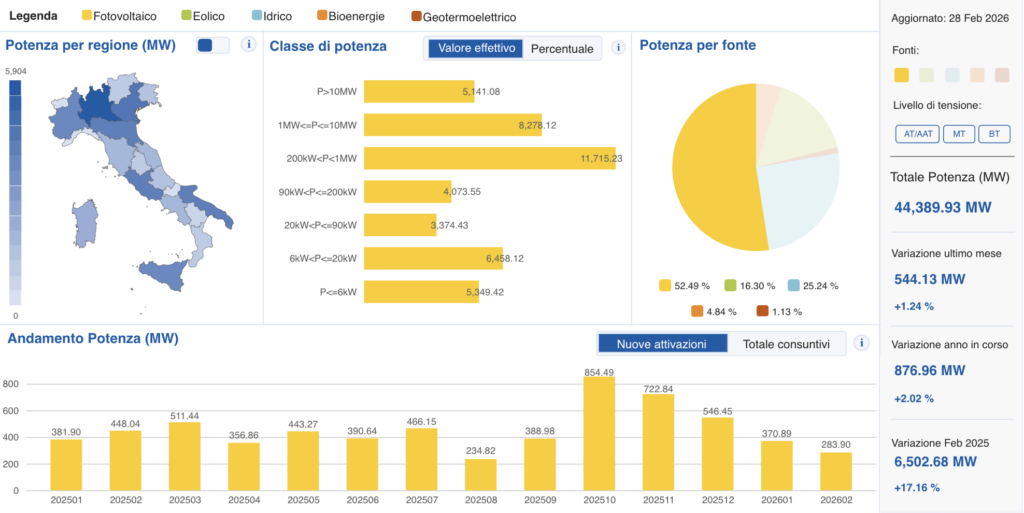 In termini di potenza, la nuova capacità di generazione aggiunta rispetto a un anno fa è pari a 6.502,68 MW (+17,16%). Da gennaio al 28 febbraio, la variazione è stata di +876,96 MW (+2%).
