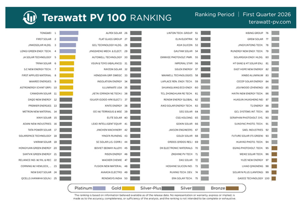 Oggi viene pubblicata una nuova classifica e analisi di valutazione per l’ecosistema produttivo del fotovoltaico: la Terawatt PV 100: rivela i 100 migliori produttori di pannelli fotovoltaici, classificati da 1 a 100 e valutati in fasce che vanno dal Platino al Bronzo.