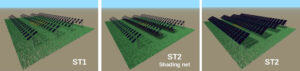 Con ST1 ci riferiamo agli impianti di prima generazione realizzati da REM TEC caratterizzati da due assi di rotazione (uno principale ed uno secondario) in grado di realizzare condizioni efficienti di inseguimento solare (sun-tracking) dotati anche di funzione back-tracking (riduzione dell’auto-ombreggiamento) che è importante con angoli solari bassi. La configurazione ST1 ha Ground Cover Ratio (GCR) piuttosto basso, < 0.14. La configurazione ST2 ha caratteristiche del tutto simili a ST1. La differenza principale tra le due configurazioni è data da una maggiore superficie dei pannelli per ST2 ed un GCR = 0.375 (che è piuttosto elevato) nel nostro studio ottenuto ampliando la superficie ombreggiante di sezioni dell’impianto ST1 con un telaio di legno ricoperto da un telo opaco.