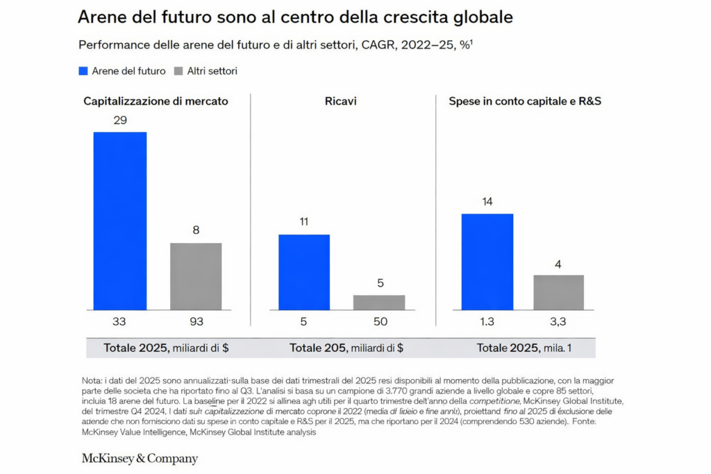L’economia globale sta entrando in una fase di trasformazione strutturale trainata da un insieme di 18 industrie strategiche, definite come “arene” che spaziano dall’intelligenza artificiale (IA) e dai semiconduttori fino ai veicoli elettrici, la robotica e l’esplorazione spaziale. Secondo un’analisi del McKinsey Global Institute, queste attività potrebbero generare tra 29 e 48 trilioni di dollari di ricavi annuali entro il 2040, consolidandosi come il principale motore di crescita economica nelle prossime decadi.