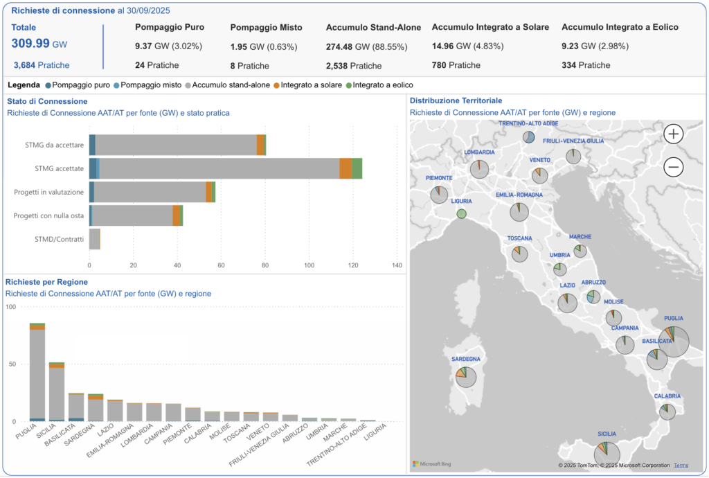 Per quanto riguarda gli impianti di accumulo, invece, Terna riporta 780 richieste per 14,96 GW di progetti integrati con fotovoltaico (erano 781 per 15,89 GW a fine agosto) su un totale di 3.684 pratiche per 309,99 GW (erano 3.679 per 313,7 GW a fine agosto). Protagonisti ancora gli accumuli stand-alone con 2.538 istanze per 274,48 GW (erano 2.535 per 275,49 GW a fine agosto).