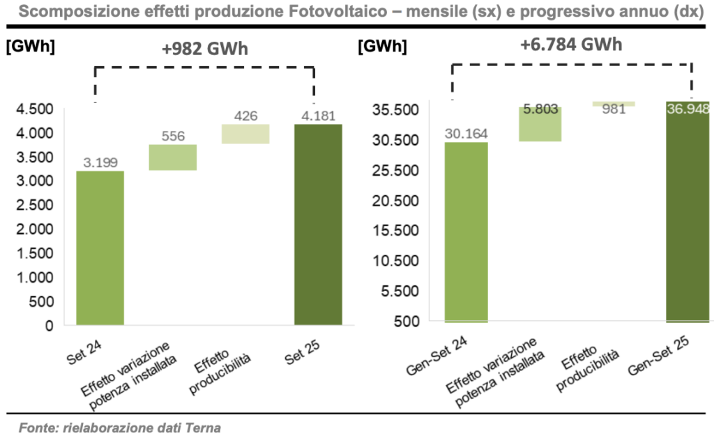 Dall’inizio dell’anno, l’aumento della produzione (+6.784 GWh) è il risultato del contributo positivo della maggiore potenza installata (+5.803 GWh) e della maggiore producibilità legata all’irraggiamento (+981 GWh).