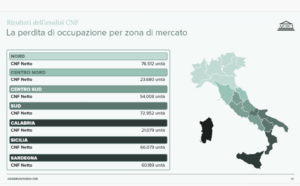 Secondo Agici, la perdita di occupazione è particolarmente grave nelle isole (oltre 120.000 posti di lavoro). Considerando le zone di mercato, si tratta di 76.512 posti persi al Nord, 23.680 al Centro-nord, 54.008 al Centro-sud, 72.952 al Sud, 21.079 in Calabria, 66.079 in Sicilia e 60,189 in Sardegna.