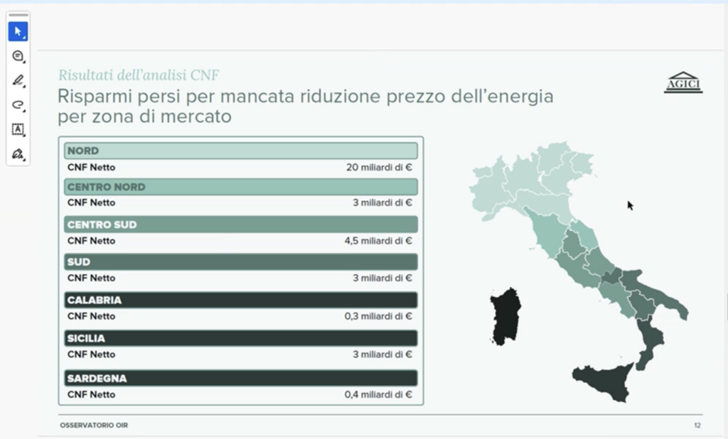 I risparmi persi per la mancata riduzione del prezzo dell’energia variano in funzione della zona di mercato: 0,3 miliardi di euro in Calabria, 0,4 miliardi in Sardegna, 3 miliardi di euro al Centro-nord, 3 miliardi al Sud, 3 miliardi in Sicilia, 4,5 miliardi al Centro-sud, 20 miliardi di euro al Nord.