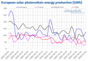 Nella settimana del 27 ottobre, la produzione di energia solare fotovoltaica è diminuita nella maggior parte dei principali mercati elettrici europei rispetto alla settimana precedente. Il mercato francese ha registrato il calo più significativo, pari al 15%, continuando una tendenza al ribasso per la terza settimana consecutiva. Il mercato italiano ha registrato il calo minore, pari all’1,5%. Al contrario, nel mercato tedesco, la tendenza negativa della settimana precedente si è invertita e la produzione di energia solare è aumentata del 7,9%. Nella settimana del 3 novembre, secondo le previsioni di AleaSoft Energy Forecasting sull’energia solare, la tendenza al ribasso si invertirà e la produzione di energia fotovoltaica aumenterà nei mercati italiano, tedesco e spagnolo.