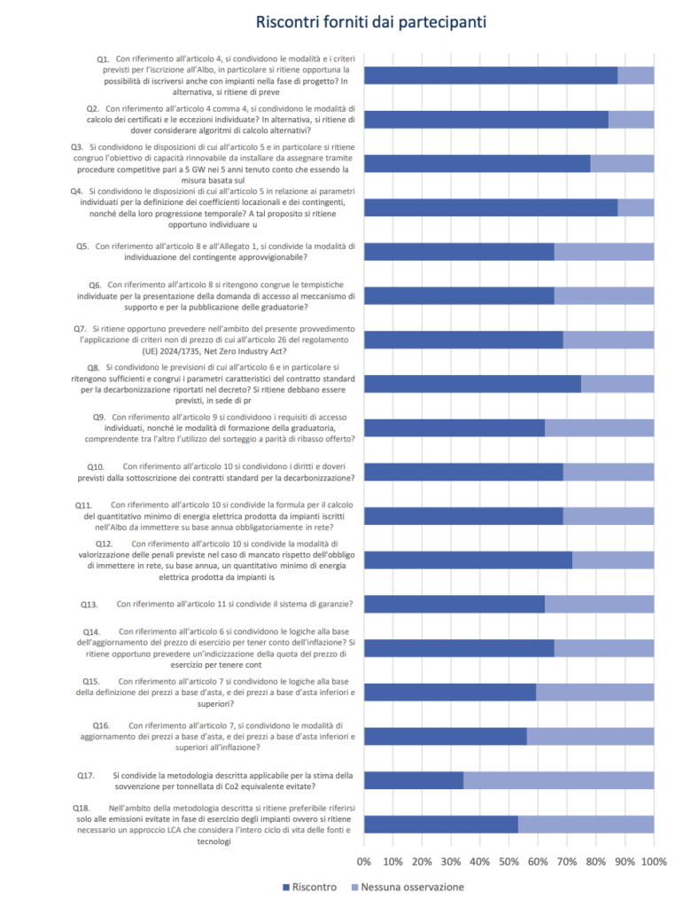 La percentuale media di risposta a tutti i quesiti è stata del 68%. Gli argomenti che hanno suscitato il maggiore interesse sono: le modalità e i criteri previsti per l’iscrizione all’albo e il relativo calcolo dei certificati; la determinazione dei coefficienti locazioni e dei contingenti; l’obiettivo di capacità rinnovabile da assegnare tramite procedure competitiva; i parametri caratteristici del contratto standard per la decarbonizzazione.