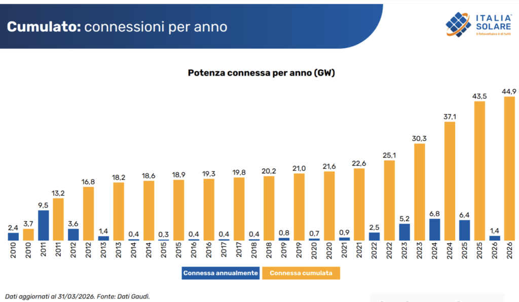Al 31 marzo 2026, in Italia, risultano connessi 2.216.994 impianti fotovoltaici, per una potenza complessiva di 44.952 MW. Lo dice Italia Solare, nel rapporto con le sue elaborazioni sui dati Gaudì di Terna, aggiungendo che, nel primo trimestre dell’anno, sono stati connessi 1.439 MW di nuova potenza, per un totale di 50.513 nuovi impianti installati.