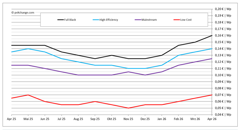 Prezzi dei moduli per tecnologia al 13 aprile 2026, comprese le variazioni mensili: