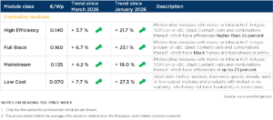 Questo andamento contrasta con diversi segnali provenienti dal lato dell’offerta. I prezzi del polisilicio sono in calo da settimane a causa della debole domanda globale e l’abolizione dei crediti d’imposta sulle esportazioni cinesi, in vigore dal 1° aprile, dovrebbe in genere esercitare una pressione al ribasso sui prezzi dei moduli.