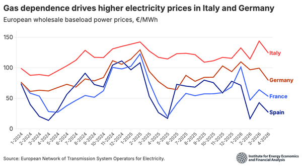 “Durante i recenti periodi di tensione geopolitica, gli aumenti dei prezzi del gas sul Title Transfer Facility (TTF) — il hub europeo di riferimento per il commercio del gas — si sono tradotti in forti picchi dei prezzi dell’energia elettrica nel mercato del giorno prima in Italia e in Germania. Ciò riflette la frequenza con cui il gas determina il prezzo marginale in questi mercati, amplificando la trasmissione degli shock dei prezzi del gas sui prezzi dell’energia elettrica. Al contrario, l’impatto è stato molto più limitato in Francia e nella penisola iberica”, ha scritto l’organizzazione senza scopo di lucro con sede negli Stati Uniti che promuove la transizione verso un’energia più pulita.