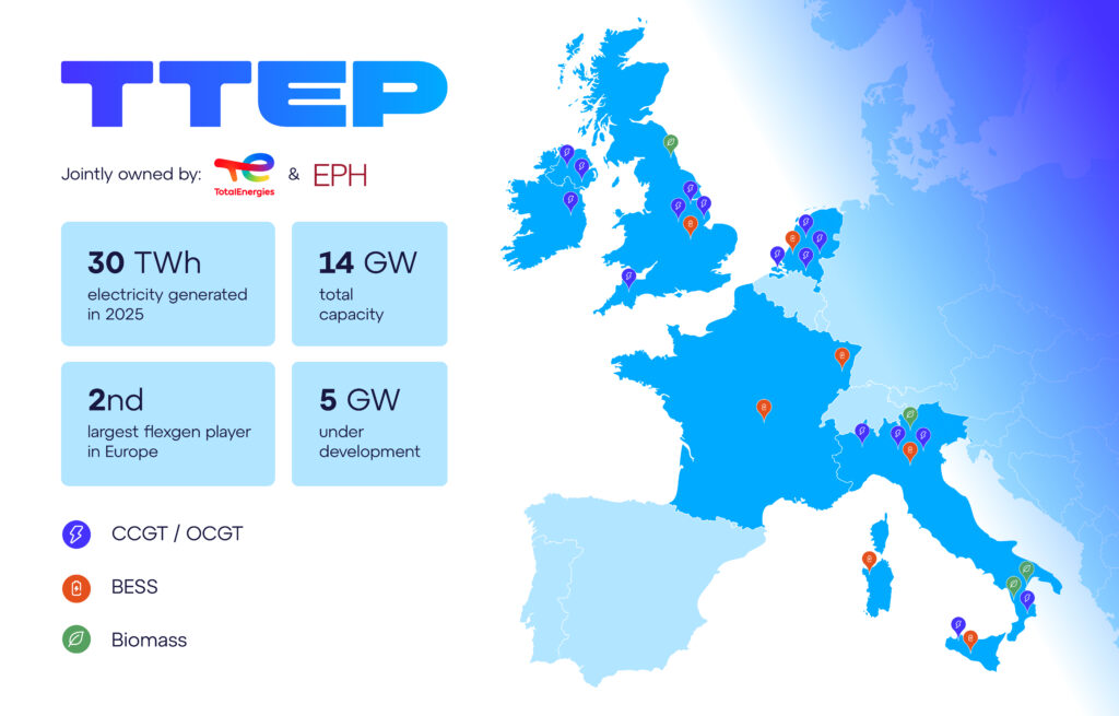 EPH e TotalEnergies hanno annunciato oggi il lancio ufficiale di TTEP, partnership al 50/50 con sede ad Amsterdam, che possiede e gestisce, attraverso le proprie controllate, centrali elettriche flessibili a gas naturale, a biomasse e impianti di accumulo energetico BESS (Battery Energy Storage Systems) in Italia, Regno Unito, Irlanda, Paesi Bassi e Francia, per una capacità complessiva di 14 GW installata o in costruzione. Nel 2025 la produzione ha raggiunto quasi 30 TWh di elettricità.