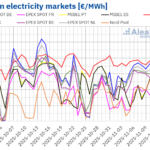 Durante la seconda settimana di novembre, i prezzi giornalieri sono rimasti sopra i 110 €/MWh sul mercato italiano. Anche il mercato tedesco ha registrato prezzi superiori a 100 €/MWh il 10, il 14 e il 16 novembre, sebbene siano rimasti al di sotto dei 110 €/MWh. Giovedì 13 novembre, il mercato italiano ha raggiunto la media giornaliera più alta della settimana, pari a 124,41 €/MWh.